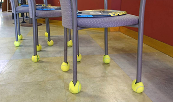 - 使用済みのスクールボールを椅子や机の脚につけることで、床への 傷防止に役立て、机や椅子を動かしたときの気になる摩擦音も 遮断します。ITCテニススクールではテニスボールの2次利用を歓迎 し、地域の学校などに寄贈しています。環境に配慮した”リユース” としても役立っております。